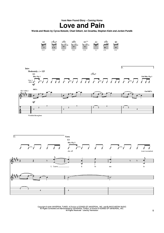 Digital Sheet Music for Love And Pain by New Found Glory, Cyrus Bolooki, Chad Gilbert, Ian Grushka, Steve Klein, Jordan Pundik scored for Guitar Tab; id:397799