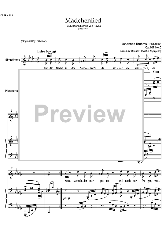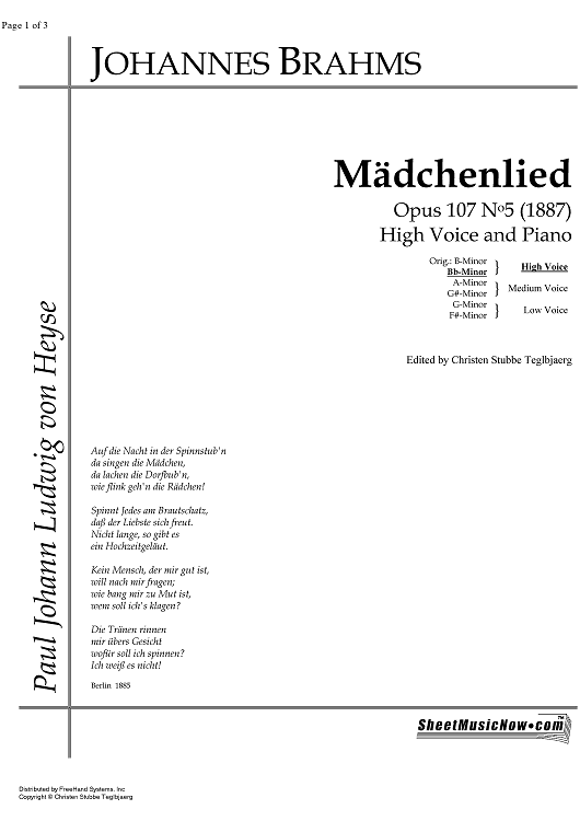 Digital Sheet Music for Mädchenlied Op.107 No. 5 by , Johannes Brahms scored for Soprano or Tenor/Piano; id:343297