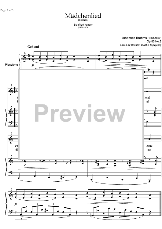 Digital Sheet Music for Mädchenlied Op.85 No. 3 by , Johannes Brahms scored for Soprano or Tenor/Piano; id:331296