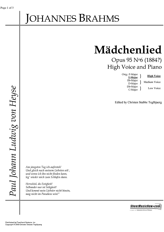 Digital Sheet Music for Mädchenlied Op.95 No. 6 by , Johannes Brahms scored for Soprano or Tenor/Piano; id:338153