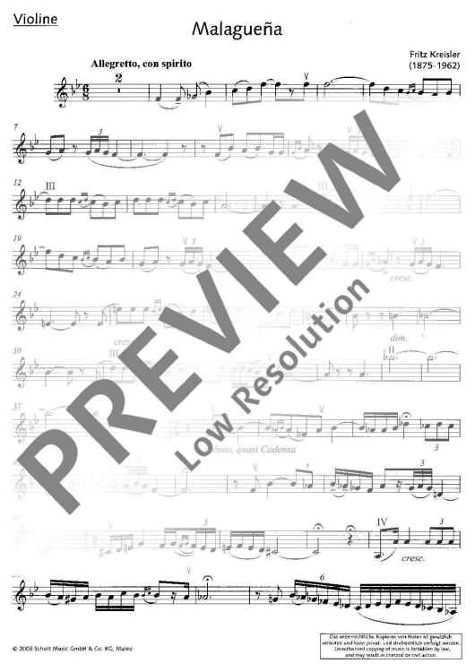Fritz Kreisler's (1875-1962) collection Klassische Manuskripte written by the violin virtuoso around the turn of the century who pretended they were transcriptions of movements by old masters such as Couperin, Pugnani, Vivaldi or Dittersdorf, was extremely popular. This did not even change when, some decades later, Kreisler 'outed' himself as composer and not just arranger of these pieces. Other compositions, however, were at once published as original works by Fritz Kreisler who wrote them as encore pieces for his solo recitals. These encores were much appreciated by the audience such that Kreisler filled half his programme with them in later years. Among these character pieces teeming with melodic charm and musical elegance is Malagueña, a Southern Spanish dancing-tune from Malaga.