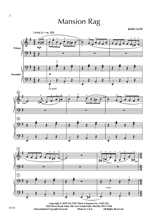 This one piano, four-hand duet is composed in true Ragtime style. The Ragtime melody is played predominantly by the Primo part, while a steady rhythmic Secondo part keeps time. This is an excellent piece for a student-teacher duet in performance, and can introduce your studio to the style of Ragtime. Check out this other duet by Justin Levitt in the FJH catalogue: The Villains.