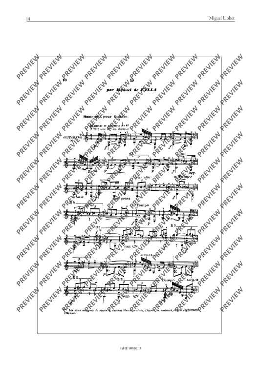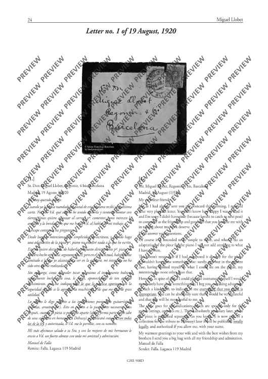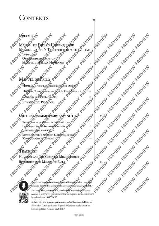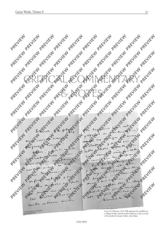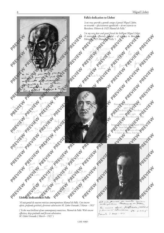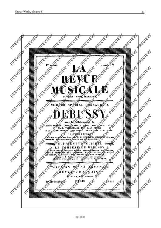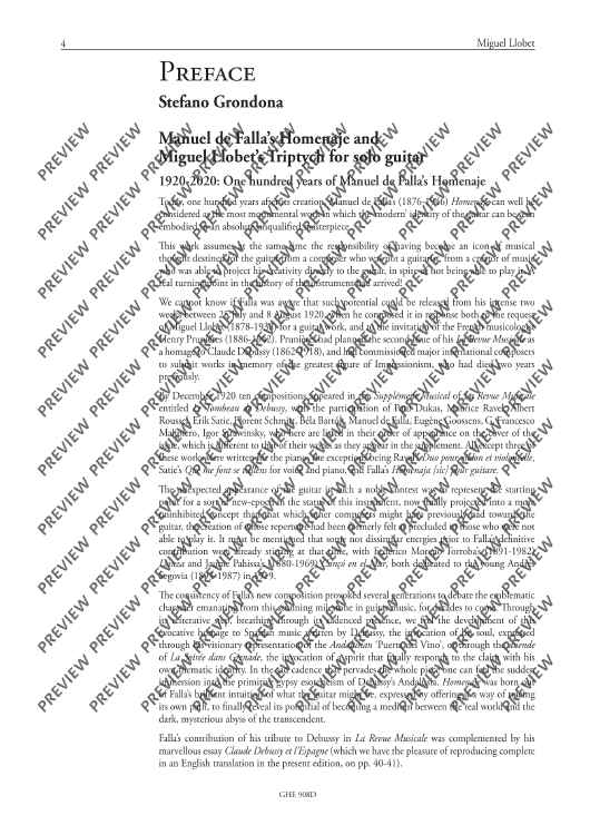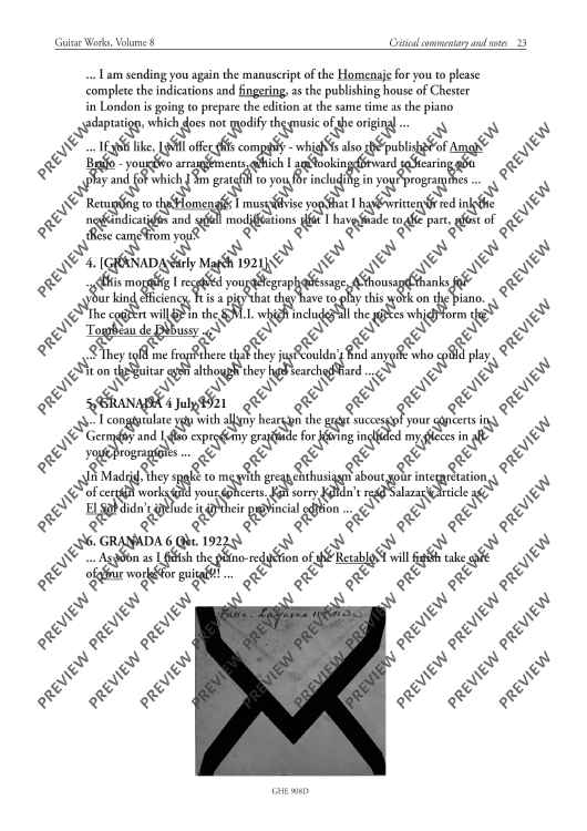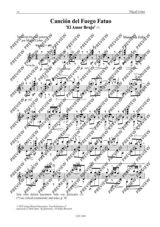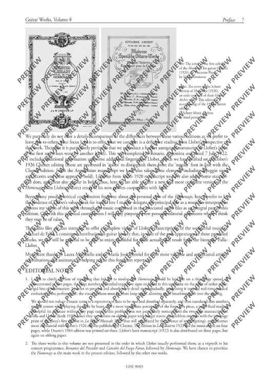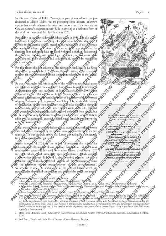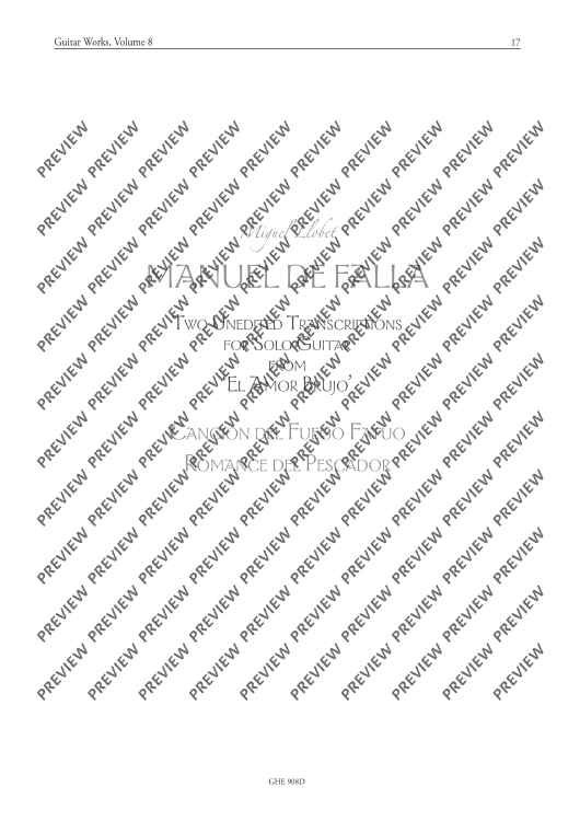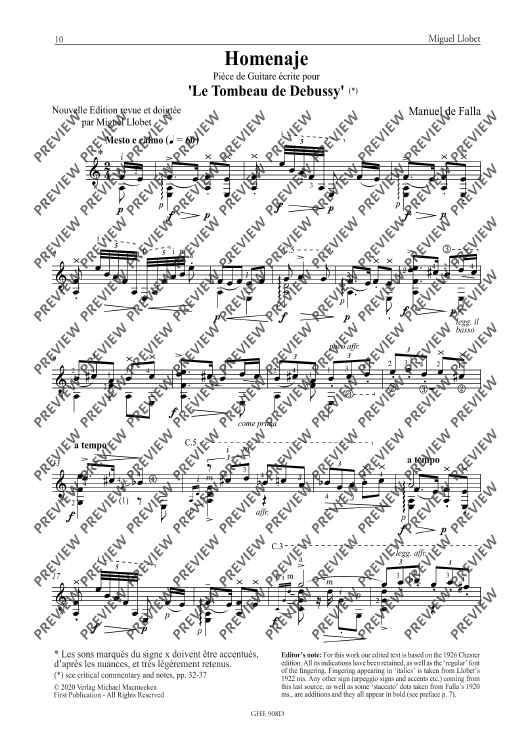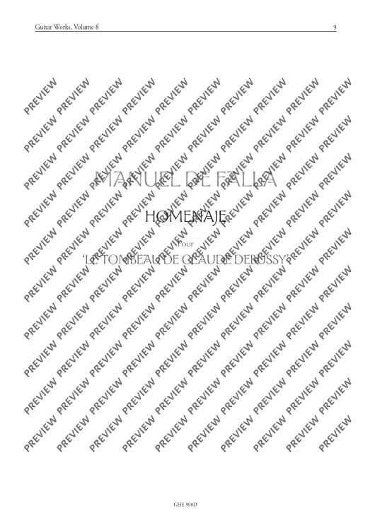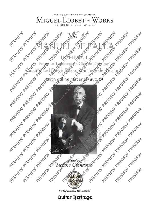 We proudly present a new authoritative reading of the 'Homenaje'. Based on the 1926 Chester edition, we have added in contrasting typography some selected features, indications and fingering from Llobet's previously unknown 1922 autograph manuscript - in fact his own performing copy! Llobet's role in the creation of this work is now confirmed as having been somewhat wider than he has been so far credited with. Newly discovered letters from Falla to Llobet confirming this are reproduced in the edition with English translations. Through these letters, we now know that even in 1920, leading up to the publication of the Homenaje in La Revue Musicale, Llobet was already a close and welcome collaborator of Falla and the former's influence and suggestions were already starting to be incorporated in the 1920 edition, a process which was to continue up to the ‘final’ Chester edition of 1926 which was and still is a totally justified standard reading of this masterpiece and the main source for our new reading, which is based on a new, faithful and balanced perspective, considered in parallel to Llobet's recently discovered own performing autograph manuscript. The edition is generously documented with rare photographs, concert programmes, etc. Iconographically rich, it includes full reproductions of three key manuscripts of the Homenaje, including Falla's original manuscript, Miguel Llobet's previously unknown 1922 manuscript, the 1920 edition from the Revue Musicale, Falla's article Claude Debussy et L'Espagne in a new English translation and the 1923 Argentinian edition of the Homenaje from 'La Guitarra'. Falla was enthusiastic about Llobet's performances of the Homenaje and he greatly appreciated Llobet’s transcriptions of the 'Romance del Pescador' and the 'Canción del Fuego Fatuo'; these together with the Homenaje figured as a 'Triptych' in Llobet's concert programmes. Both transcriptions are published here for the first time, prepared from Llobet's autograph manuscripts.
