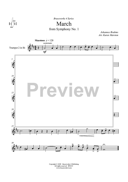 Digital Sheet Music for March - Trumpet 2 in B-flat by Johannes Brahms, Karen Marston scored for Brass Quartet; id:411295