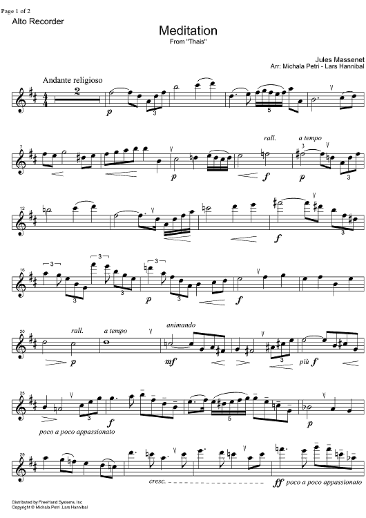 Digital Sheet Music for Meditation from Thais - Recorder by Lars Hannibal, Michala Petri, Jules Massenet scored for Recorder/Guitar; id:329770