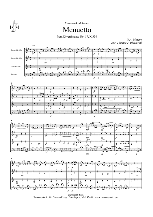 Digital Sheet Music for Menuetto - Score by Wolfgang Amadeus Mozart, Thomas J. Blackwell scored for Brass Quartet; id:318821