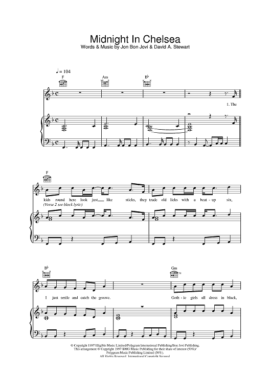 Digital Sheet Music for Midnight In Chelsea by Jon Bon Jovi scored for Piano/Vocal/Chords; id:376453