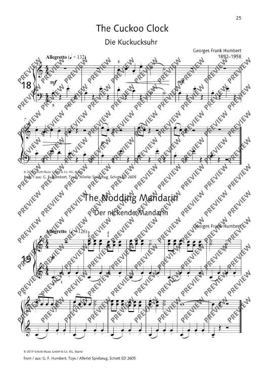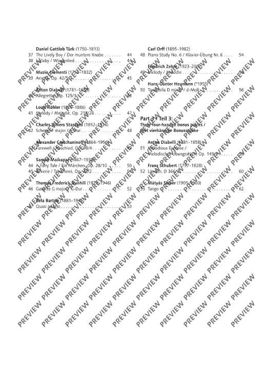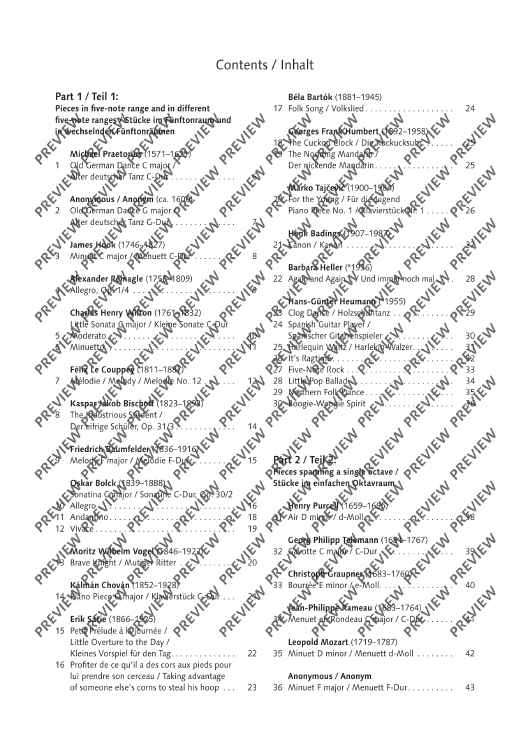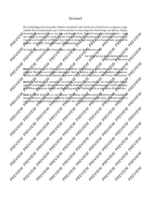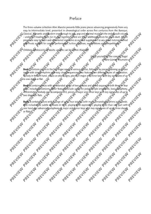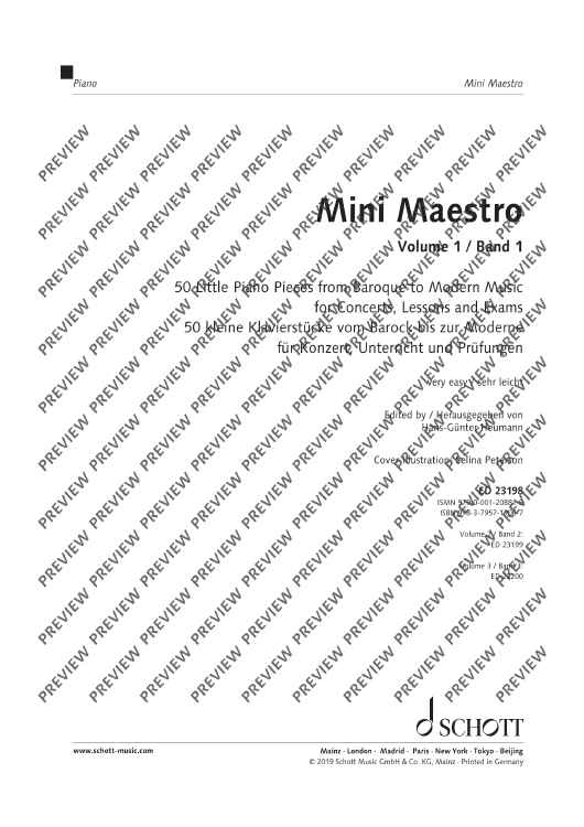 The three-volume collection Mini Maestro presents little piano pieces advancing progressively from very easy to intermediate level, presented in chronological order across five centuries from the Baroque, Classical, Romantic and Modern eras through to jazz, pop and minimal music. At the end of each volume – under the heading More fun to play together – there are three additional pieces for piano duet. All the pieces are easy to learn and offer varied repertoire as an ideal supplement to any piano tutorial method with music suitable for concert performance, tuition purposes, examinations and competitions. Book 1 contains pieces in the five-finger range at various pitches, followed by pieces spanning an octave range with simple rhythms and easy chord sequences. Also featured are differing styles of articulation, melody in the left hand, octave or ottava signs, pieces in major and minor keys with key signatures of up to one sharp or flat. Book 2 contains pieces with an extended range of two octaves and chord sequences with three or four parts, including inversions. Other features include using the pedal, simple ornaments, basic polyphony, differentiating melody and accompaniment, pieces in major and minor keys with key signatures of up to two sharps or flats. Book 3 contains pieces with a range of up to four octaves with more demanding rhythms and speeds. Also included are subtle contrasts in tone, playing with expression, playing more than one part with one hand and advanced polyphony in major and minor keys with key signatures of up to three sharps or flats.