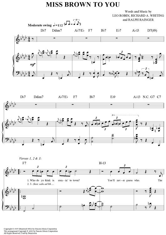 Digital Sheet Music for Miss Brown to You by Leo Robin, Ralph Rainger, Richard A. Whiting, Peter Cincotti scored for Piano/Vocal/Chords; id:305329