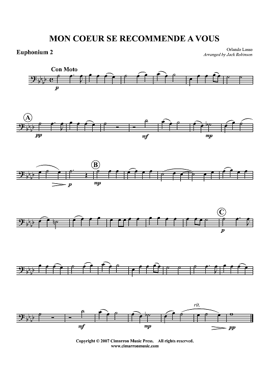 "Mon Coeur Se Recommende a Vous - Euphonium 2 BC/TC" Sheet Music by Orlando de Lassus