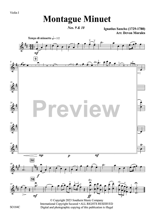 Digital Sheet Music for Montague Minuet - Violin 1 by Ignatius Sancho, Devon Morales scored for Orchestra; id:507671