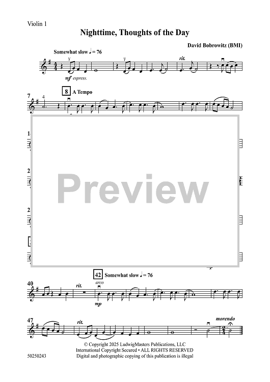 Digital Sheet Music for Nighttime Thoughts of the Day - Violin 1 by David Bobrowitz scored for String Orchestra; id:508684