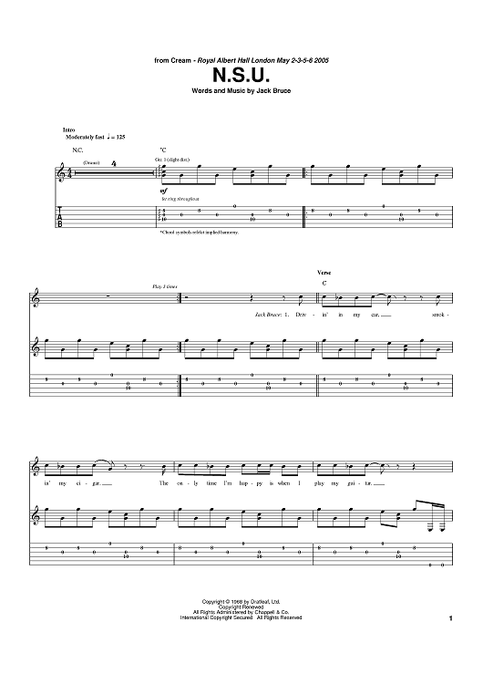 Digital Sheet Music for N.S.U. by Cream, Jack Bruce scored for Guitar Tab; id:392534