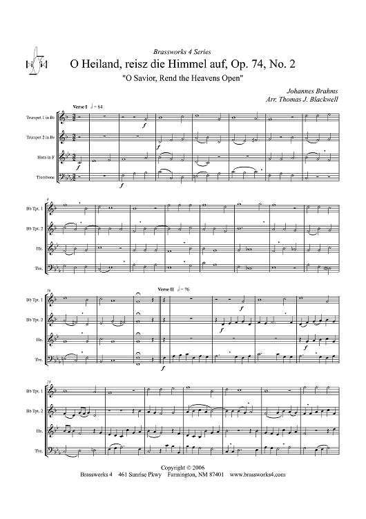 Digital Sheet Music for O Heiland, reisz die Himmel auf, Op. 74, No. 2 - Score by Johannes Brahms, Thomas J. Blackwell scored for Brass Quartet; id:360890