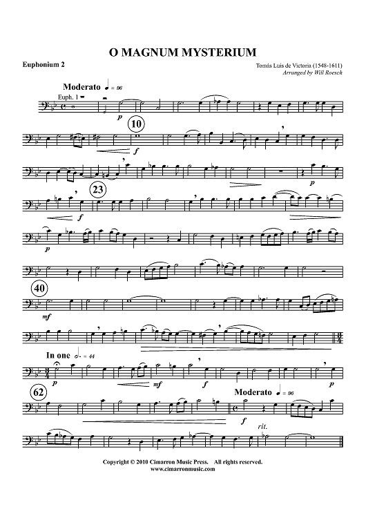 Digital Sheet Music for O Magnum Mysterium - Euphonium 2 BC/TC by Tomás Luis de Victoria, Will Roesch scored for Tuba Quartet; id:426994