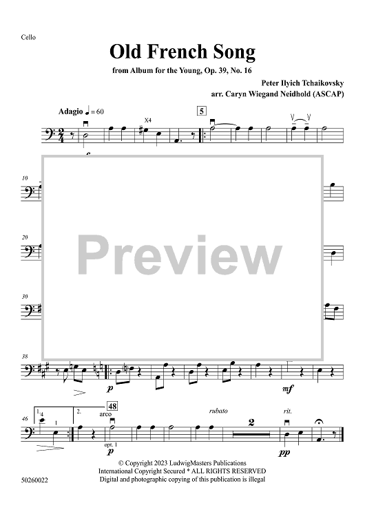 Digital Sheet Music for Old French Song - Cello by Peter Ilyich Tchaikovsky, Caryn Wiegand Neidhold scored for Solo String Instrument and String Orchestra; id:507718