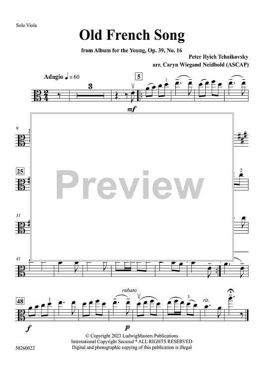 Digital Sheet Music for Old French Song - Solo Viola by Peter Ilyich Tchaikovsky, Caryn Wiegand Neidhold scored for Solo String Instrument and String Orchestra; id:507712