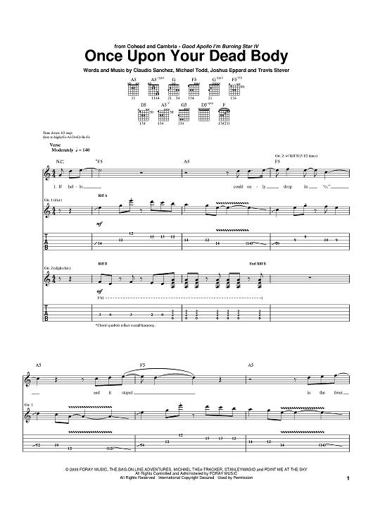 Digital Sheet Music for Once Upon Your Dead Body by Coheed and Cambria, Josh Eppard, Claudio Sanchez, Travis Stever, Michael Todd scored for Guitar Tab; id:391192