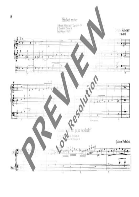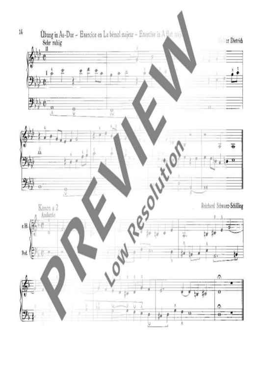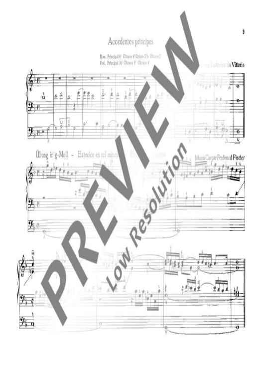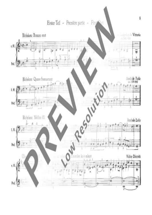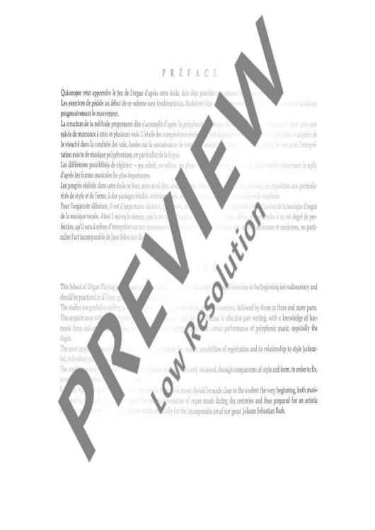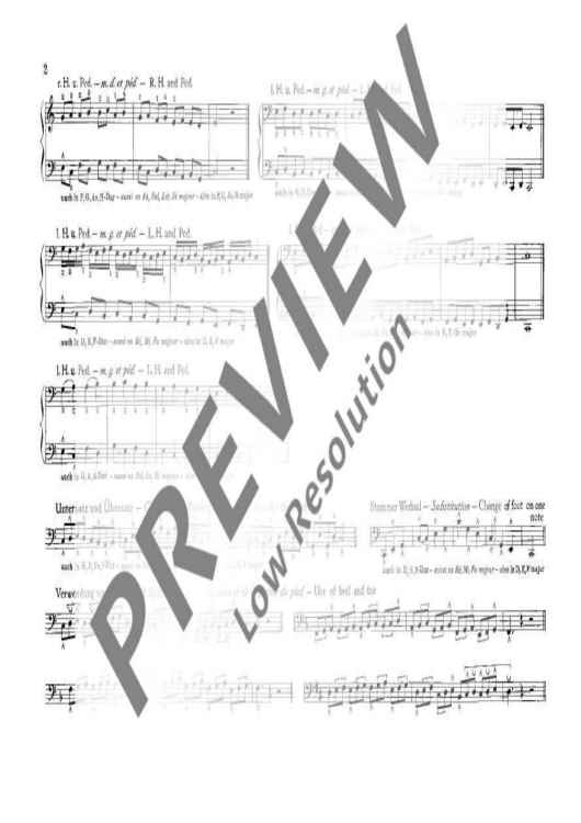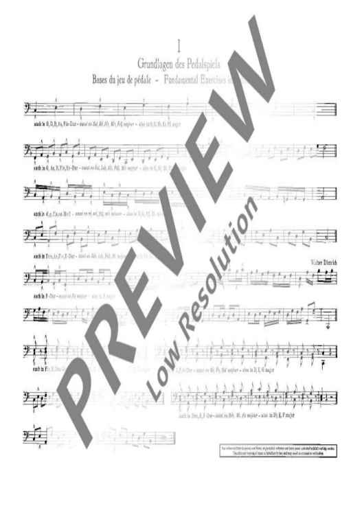 This method of organ playing presupposes a certain technical skill on the piano. The pedal exercises at the beginning are fundamental and should be practiced in all keys with gradually increasing tempo. The structure of this method is based on the increasing polyphony: two-part pieces are followed by three-and multi-part pieces. Studying the strict structure of the polyphonic compositions, getting a feel of the liveliness of these parts, their coming, going and returning, all this, with the knowledge of harmonic form and architectonic values, provides the essential background for the correct interpretation of polyphonic music, especially of the fugue. The most important musical forms have been used to illustrate the various possibilities of registration and its relationship to style (colourful, solo and smooth playing).Progress within this method is made in a winding pattern, i.e. by falling frequently back on earlier aspects, through the juxtaposition of special stylistic and formal features, in order to consolidate them or add to variety. It is very important that the evolution of organ music from vocal music should be made clear to the student the very beginning, both musically and intellectually. He will be shown the technical evolution of organ music over the centuries and thus be prepared for a really artistic performance and interpretation of old and new works on his instrument, especially for the incomparable art of our great Johann Sebastian Bach.