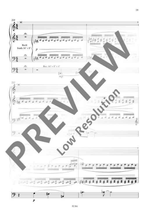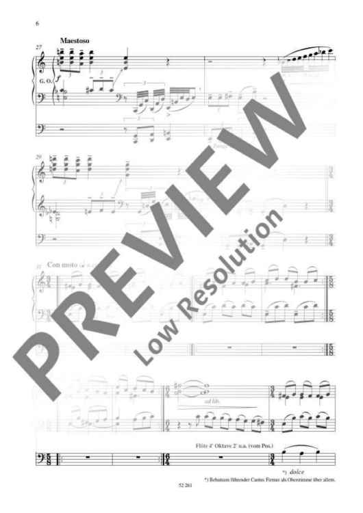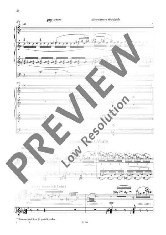 As a counterpart to the Organ Symphony No. 1 Pater Noster (ED 9937), the Organ Symphony No. 2 offers softer and more mysterious (Marian) sound worlds, sketching stages of Mary's life: an adoring Salve Regina grows from the mystic source, followed by Berceuse pour Marie as a lullaby of the Christmas events. The third movement Mater Dolorosa falls back on the well-known Gregorian sequence Stabat Mater, taking Mary's pain at the cross as its central theme. The finale treats the Ave Maris Stella in a crescendo from pp to ff in a positive and solemn manner, in memory of Mary's assumption. It is advisable to use an organ with at least three manuals.