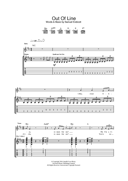 Digital Sheet Music for Out Of Line by The Bravery, Samuel Endicott scored for Guitar Tab; id:386383