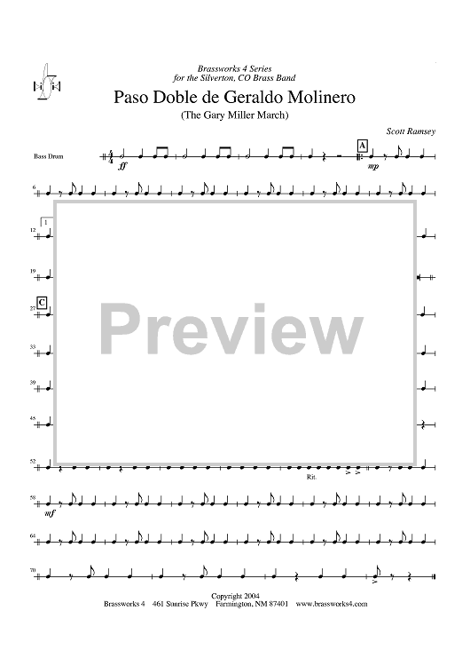 Digital Sheet Music for Paso Doble de Geraldo Molinero (The Gary Miller March) - Bass Drum by Scott A. Ramsey scored for Brass Ensemble; id:428217