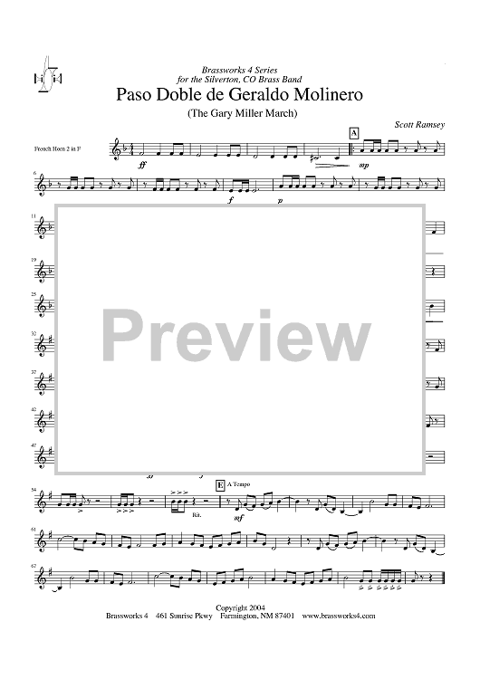 Digital Sheet Music for Paso Doble de Geraldo Molinero (The Gary Miller March) - Horn 2 in F by Scott A. Ramsey scored for Brass Ensemble; id:428210