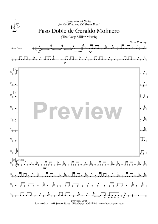 Digital Sheet Music for Paso Doble de Geraldo Molinero (The Gary Miller March) - Snare Drum by Scott A. Ramsey scored for Brass Ensemble; id:428216