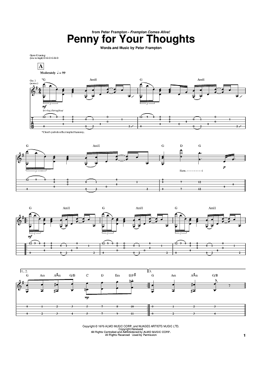 Digital Sheet Music for Penny For Your Thoughts by Peter Frampton scored for Guitar Tab; id:402672