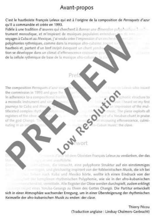 The composition Perroquets d’azur owes its existence to the oboist François Leleux who issued the commission in 1993 and gave the first performance of the work. In adherence to a compositional tradition which attempts to transfer a polyphonic structure to a monodic instrument and simultaneously inspired by the folkloristic music I heard on my first journeys to Cuba and Mexico, it was my intention to communicate an impression of the multifaceted complex rhythmic polyphony characterising Afro-Cuban music. The piece exploits all registers of the oboe and additionally incorporates the brief incipit of a Yoruban chant in praise of the god Changó. The music develops in an atmosphere of increasing effervescence, culminating in an intensification of the rhythmic nucleus of Afro-Cuban music: the clave.