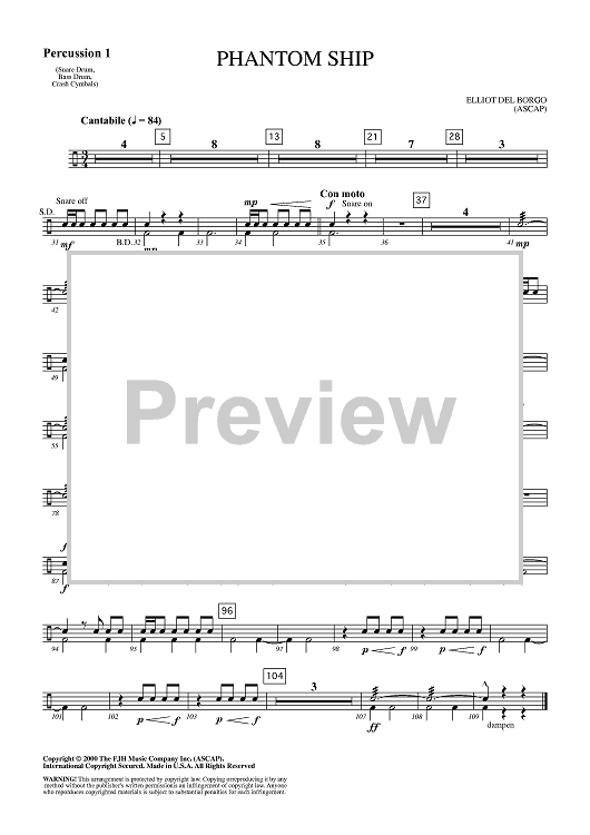 Digital Sheet Music for Phantom Ship - Percussion 1 by Elliot Del Borgo scored for Concert Band; id:404313