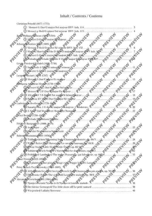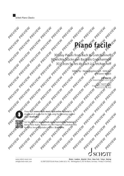 Exquisite easy piano pieces, compiled for music lessons and first auditions by the piano teacher Marianne Magolt. The volume contains easy Baroque, Classical and Romantic pieces and is perfectly suited for the 'first concert' of young pianists. The downloadable recordings encourage personal interpretation.