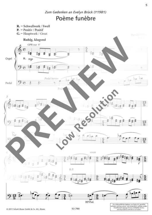 This organ piece is ideal as liturgical piece for Lent and All Saints' Day/Sunday before Advent commemorating the dead but also for organ concerts on the topic of death and transitoriness. 'Poème funèbre is a very personal piece which, like an epitaph, shall bring to mind the death of a person who died young. I think such a remembrance is important, for it connects people with the dead. The first part is a musical expression of lament and grief: Within its symmetrical structure, the composition rises toward a dramatic climax and, diminishing, returns back to its starting point. This part is followed by a second quiet part in which the Gregorian antiphon 'In paradisum' is paraphrased in soft colours, as an expression of consolation and trusting to the sense of the yet incomprehensible.' (Harald Feller)