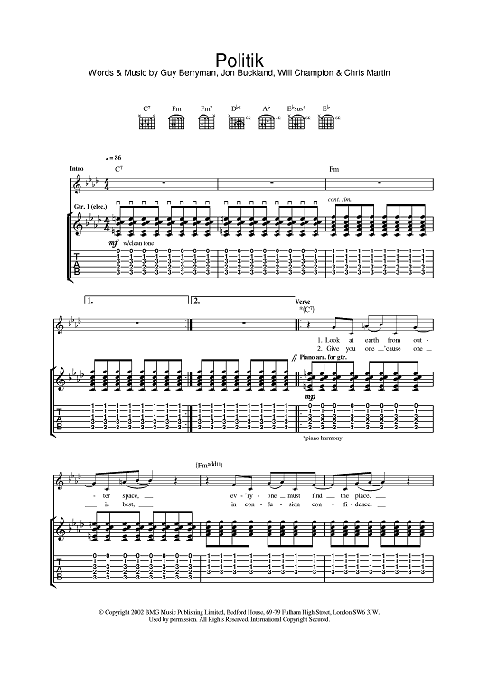Digital Sheet Music for Politik by Coldplay scored for Guitar Tab; id:377671
