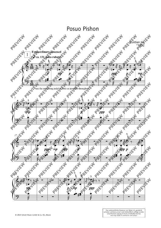 With Posuo Pishon, Xuntian He continues his series of compositions for piano that refuse to be bound by any cultural or academic tradition. Ultimately, the Chinese composer feels no obligation to either Western or Eastern culture. Instead, He explores the surprising melodic and rhythmic structures that are possible on the piano in accordance with his individual style.
