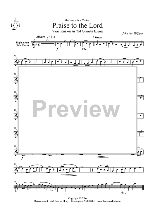 Digital Sheet Music for Praise to the Lord - Euphonium TC by John Jay Hilfiger scored for Brass Quartet; id:321402