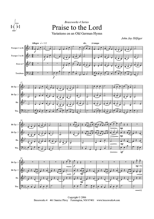 Digital Sheet Music for Praise to the Lord - Score by John Jay Hilfiger scored for Brass Quartet; id:321397