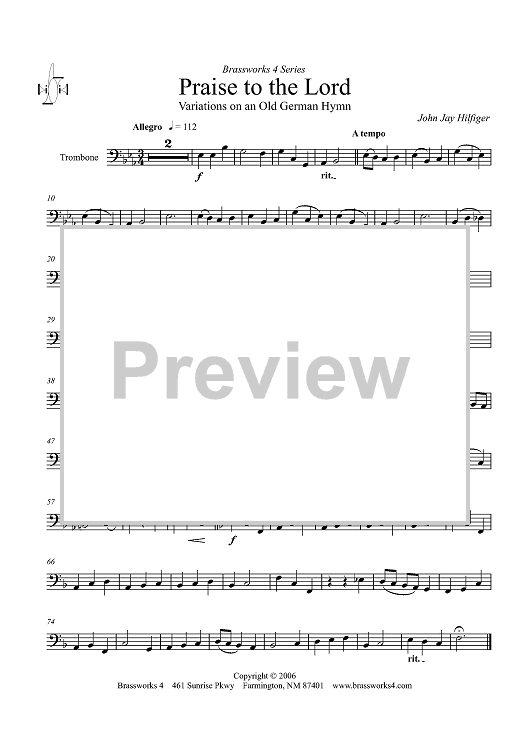 Digital Sheet Music for Praise to the Lord - Trombone by John Jay Hilfiger scored for Brass Quartet; id:321403
