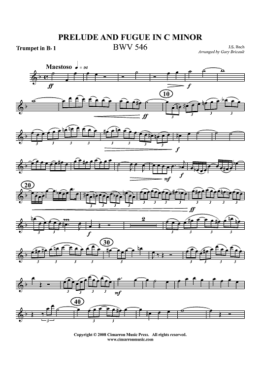 Digital Sheet Music for Prelude and Fugue in C Minor, BWV 546 - Trumpet 1 in Bb by Johann Sebastian Bach, Gary Bricault scored for Brass Quintet; id:416316