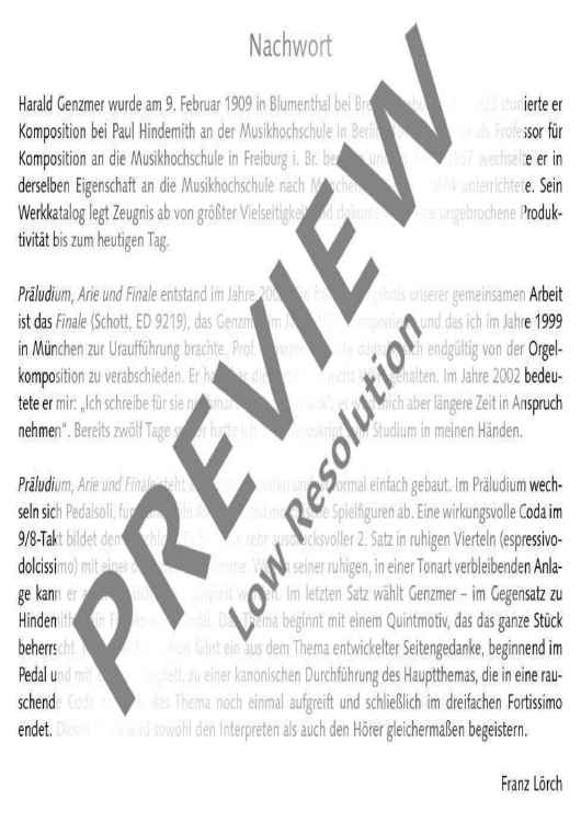 'Präludium, Arie und Finale' steht auf tonalem Boden und ist formal einfach gebaut. Im Präludium wechseln sich Pedalsoli, fundamentale Akkordik und motorische Spielfiguren ab. Eine wirkungsvolle Coda im 9/8-Takt bildet den Abschluss. Es folgt ein sehr ausdrucksvoller 2. Satz in ruhigen Vierteln (espressivo-dolcissimo) mit einer obligaten Solostimme. Wegen seiner ruhigen, in einer Tonart verbleibenden Anlage kann er auch für sich allein gespielt werden. Im letzten Satz wählt Genzmer ein Fugato ohne Pedal. Das Thema beginnt mit einem Quintmotiv, das das ganze Stück beherrscht. Nach der Exposition führt ein aus dem Thema entwickelter Seitengedankte, beginnend im Pedal und mit Triolen umspielt, zu einer kanonischen Durchführung des Hauptthemas, die in eine rauschende Coda mündet, das Thema noch einmal aufgreift und schließlich im dreifachen Fortissimo endet. Dieses Stück wird sowohl den Interpreten als auch den Hörer gleichermaßen begeistern.