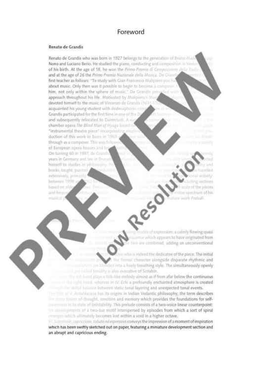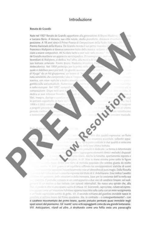 The 48 Preludes by the Venetian composer Renato de Grandis (1927-2008) were composed, largely, between 1998-2002. It was only subsequently that he arranged them into 4 cycles of 12 preludes, drawing also from earlier compositions. Written in a traditional pianistic style, they are short sketches which are sometimes characterized by musical thoughts, sometimes by moods or by natural phenomena. The fourth volume presented here is once again divided into two cycles of 6 preludes each, with the first cycle paying tribute to the landscapes and towns of Friuli north of Venice.