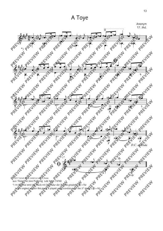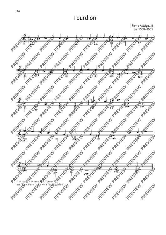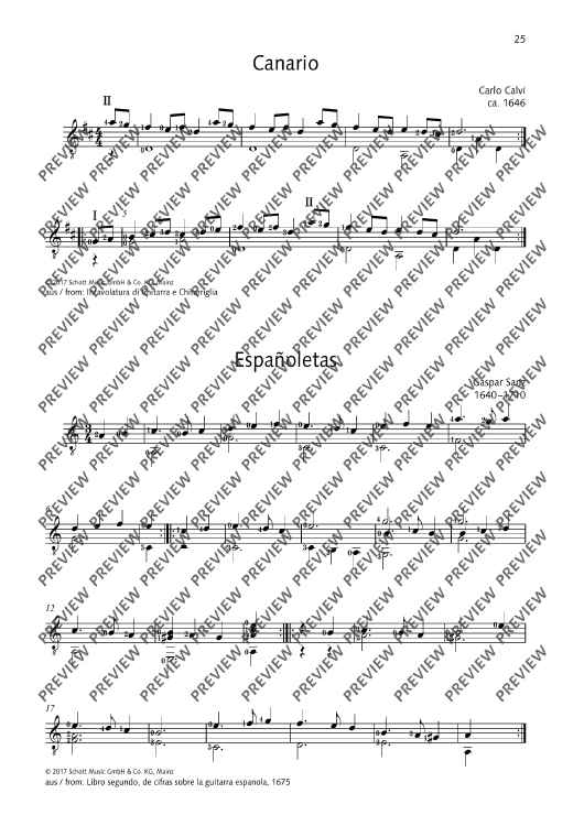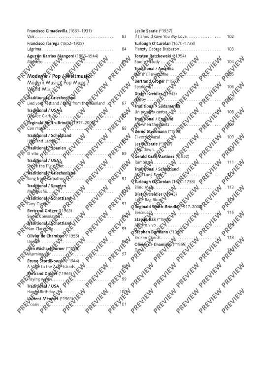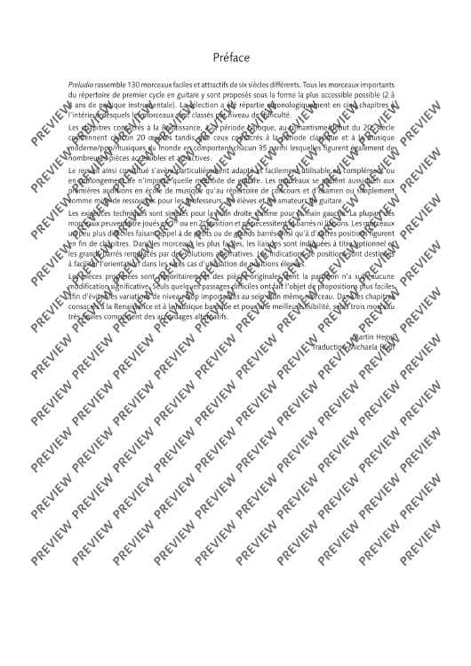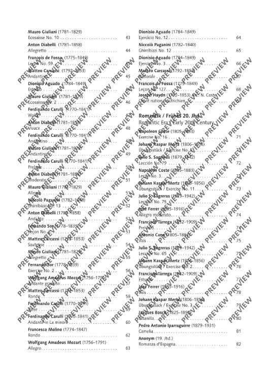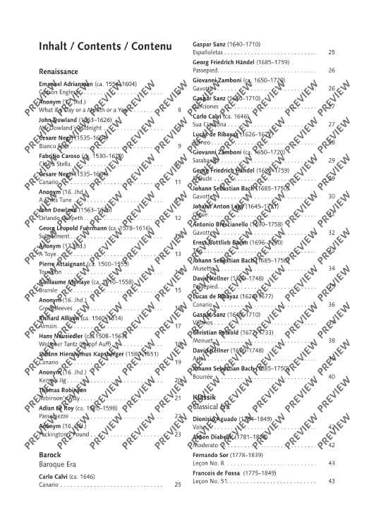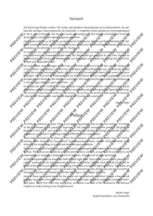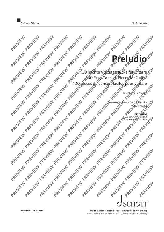 Preludio contains 130 easy attractive performance pieces from six centuries, thus offering the most important pieces for beginners' guitar lessons in one comprehensive volume. The repertoire is ideal for first performances at music schools, as pieces for competitions and examinations or just as a 'treasure trove' for teachers, pupils, students, and guitar lovers. The selected pieces can be played in the second to fourth year of guitar lessons. They are divided chronologically into five chapters and arranged progressively according to their level of difficulty. Each chapter refers to another epoch: Renaissance – Baroque – Classical period – Romanticism and early 20th century – modern, pop and world music. The result is a tune book which can already be used during or immediately after studying any guitar method. Most pieces can be played in the 1st and 2nd positions, without requiring any barré fingering or ties and slurs. The somewhat more difficult pieces that require small and large barré fingering as well as position playing are placed at the end of each chapter. The majority of the pieces are original works, and the editors have refrained from making any radical simplifications. Only a few difficult passages have alternatively been made easier to play such that the level of difficulty within a piece does not vary too much.