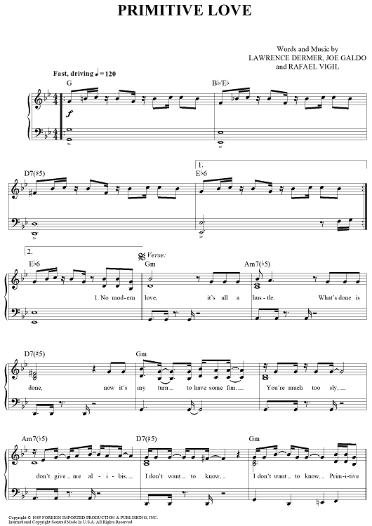 Digital Sheet Music for Primitive Love by Lawrence Dermer, Miami Sound Machine, Joe Galdo, Suzi Carr scored for Piano/Vocal/Chords; id:456312