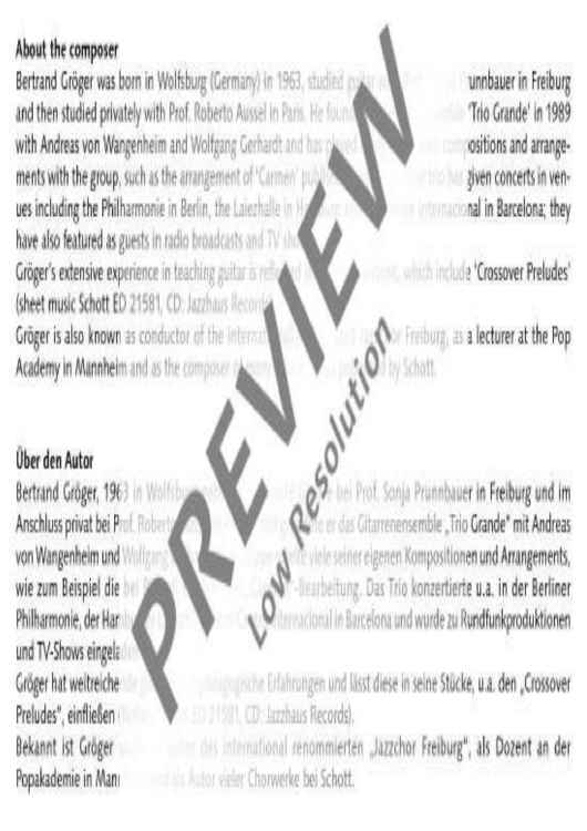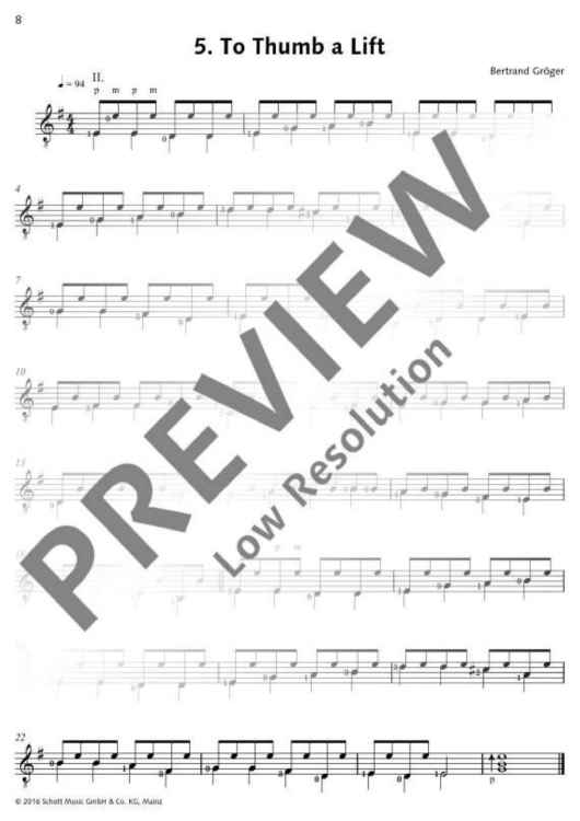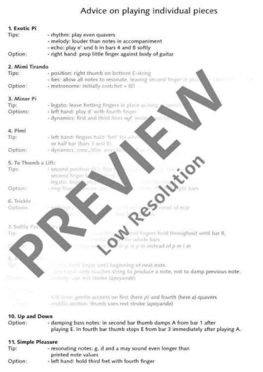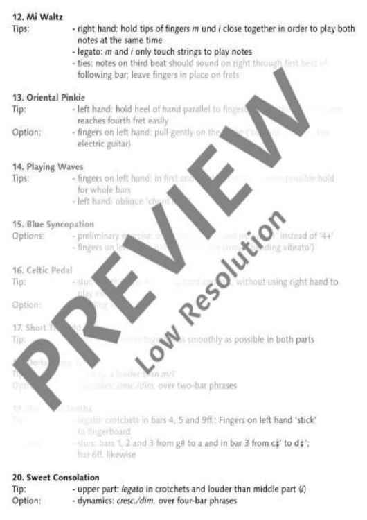 This edition is structured similarly to an instrumental method. It starts with 'easy' pieces and gradually becomes more demanding, while introducing new musical sounds. The aim of these small compositions is to coax beautiful music out of the guitar – music that is enjoyable to both players and audience alike – while using as few technical means as possible.