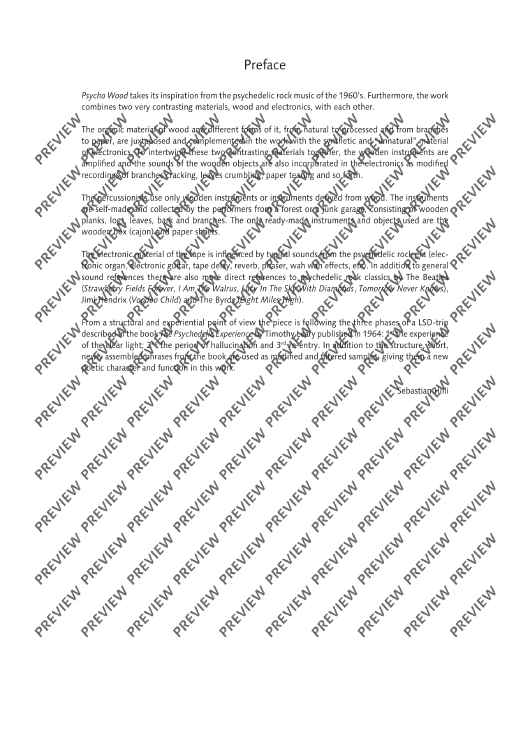 Das Stück ist von der psychedelischen Rockmusik der 1960er Jahre inspiriert und kombiniert die sehr gegensätzlichen Materiale Holz und Elektronik. Psycho Wood zeichnet einen LSD-Trip nach, der in einem Buch von Timothy Leads beschrieben wurde.