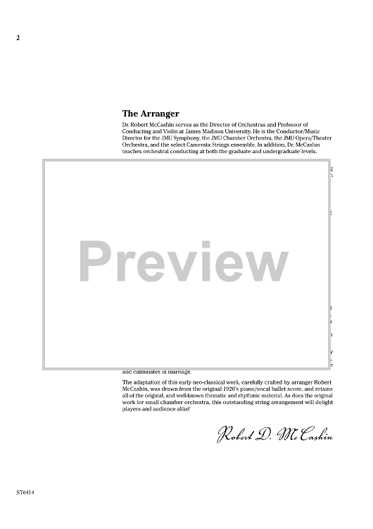 Featuring the overture of Stravinsky’s landmark work, this adaptation was drawn from the original piano/vocal ballet score, and retains all of the original, well-known thematic and rhythmic material. An ideal way to feature several soloists within the ensemble, this outstanding string arrangement will delight players and audience alike! (2:30)