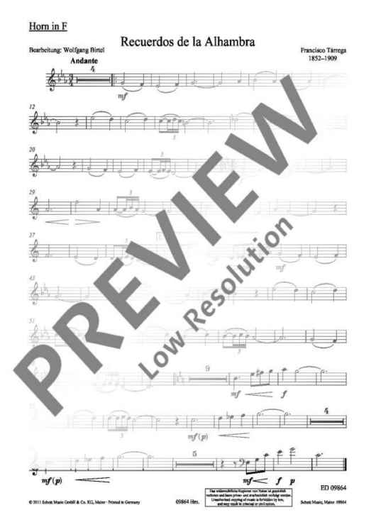 Composed in 1886, the tremolo study 'Recuerdos de la Alhambra' is without doubt Tarrega's best-known piece. It evokes memories of the Moorish citadel located on a hill in the Spanish Granada. Thanks to the present arrangement, the enchanting gem with its slightly melancholy tinge - perhaps inspired by Georges Bizet's 'Je crois entendre encore' from The Pearl Fishers - is now also available for instruments other than the guitar.