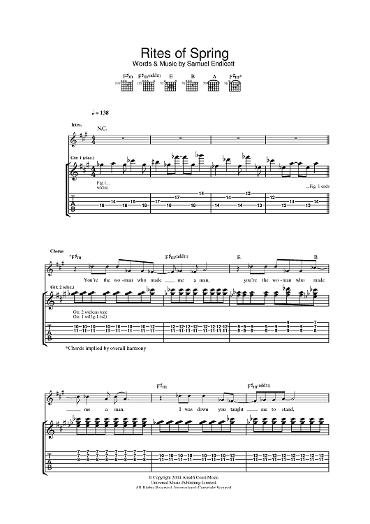 Digital Sheet Music for Rites Of Spring by The Bravery, Samuel Endicott scored for Guitar Tab; id:386385