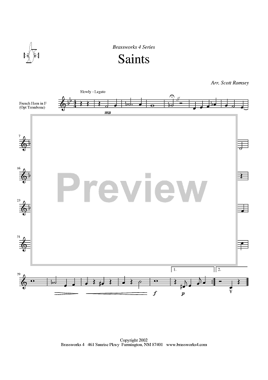 Digital Sheet Music for Saints - Horn in F by Scott A. Ramsey scored for Brass Quartet; id:316853