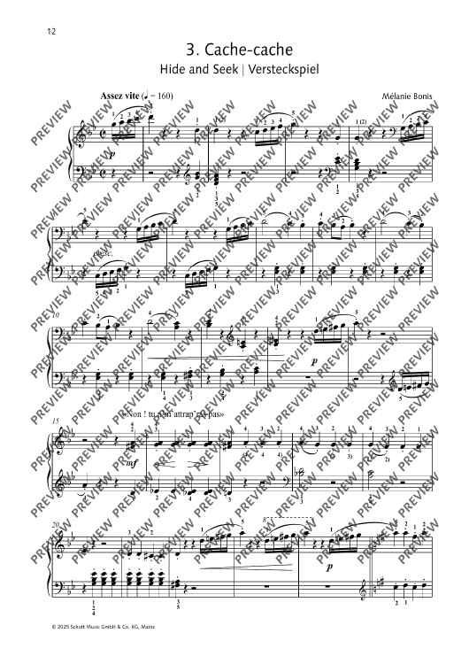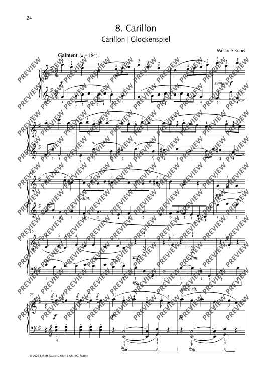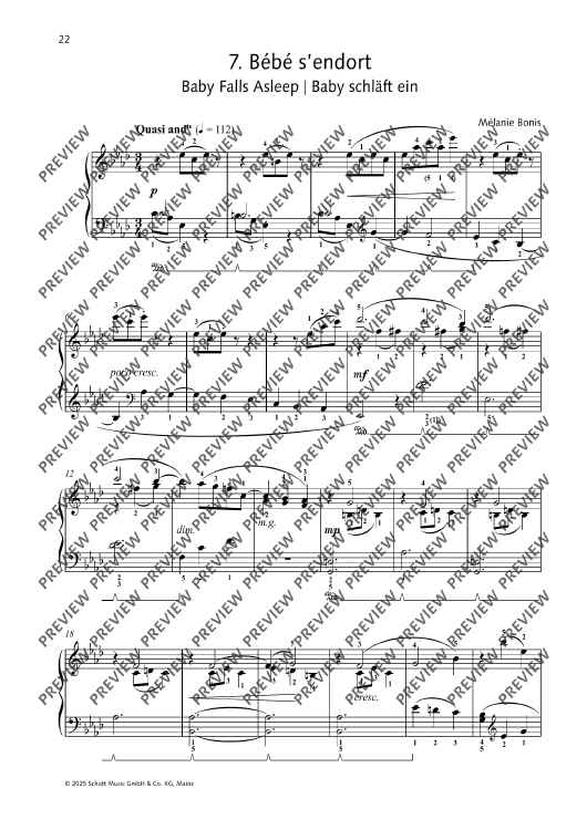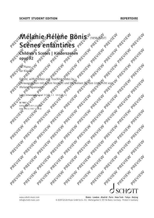 Scènes enfantines (Children's Scenes) by the composer Mélanie Bonis was first published in 1912. The collection contains eight programmatic pieces that are not only exciting and interesting to play, but also impart useful technical and musical skills. The works, which are of medium difficulty, stimulate the imagination and are ideal as concert or examination repertoire. Includes tips by Melanie Spanswick.